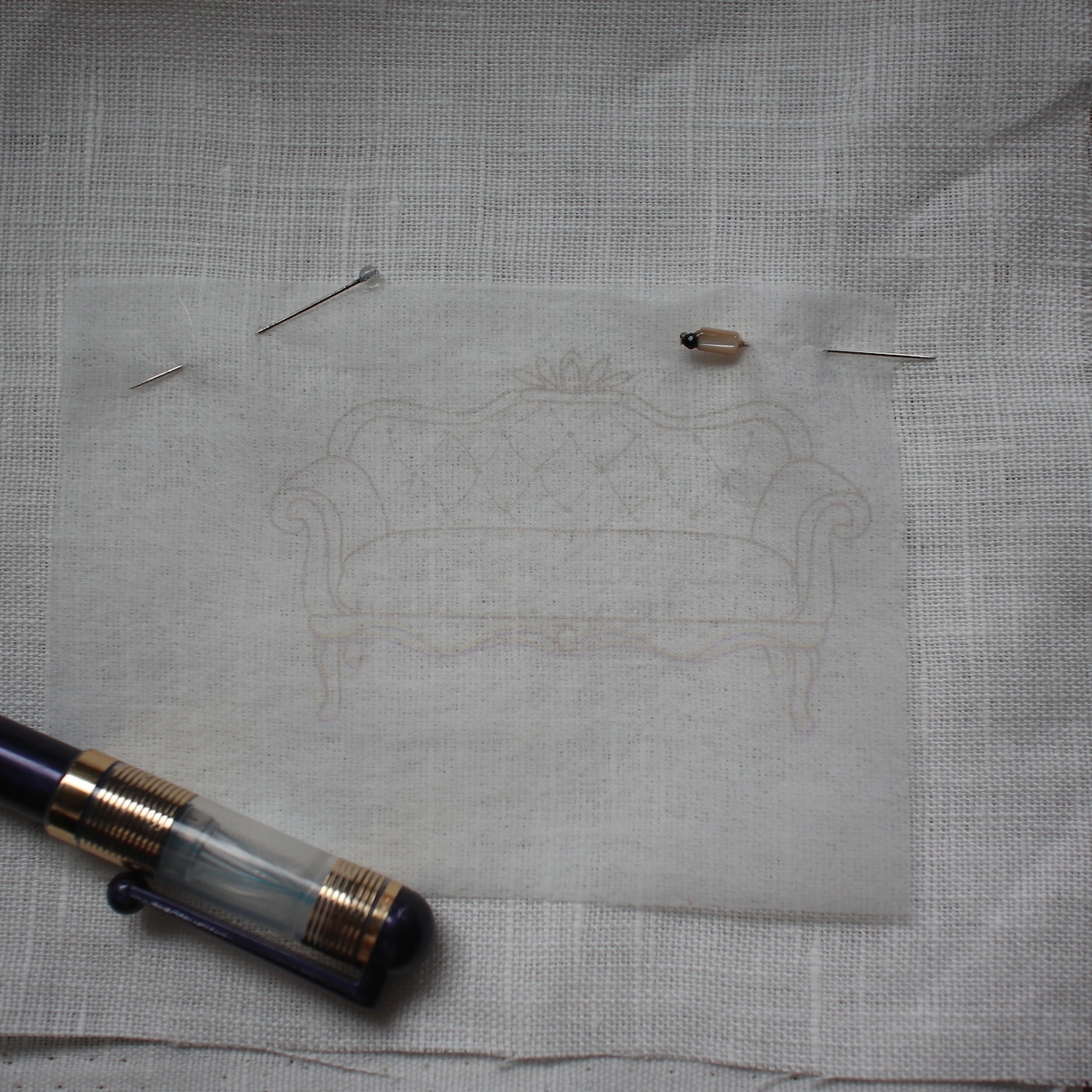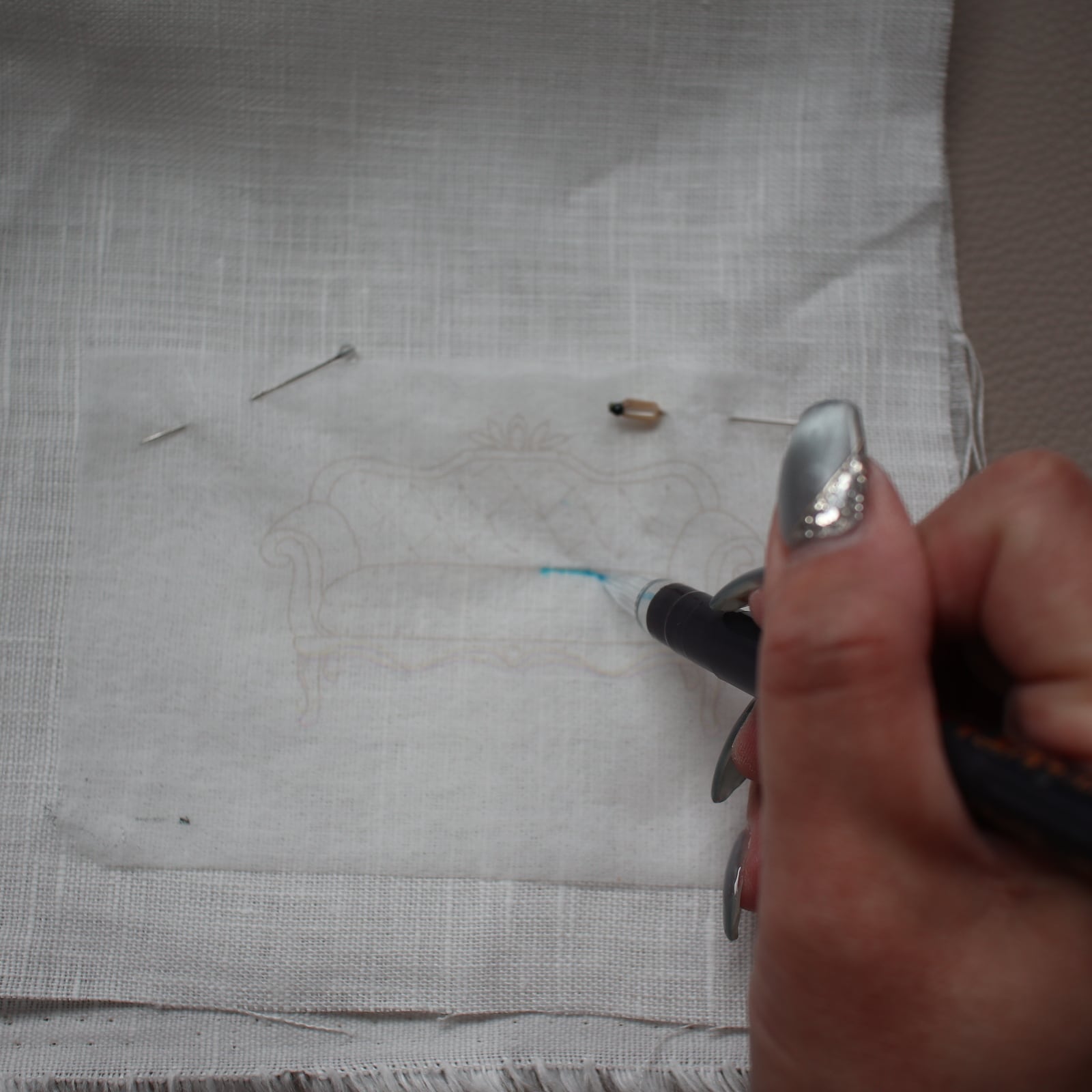 図案が印刷済みのムーンベールを布の上に置き、図案の上からチャコペンでなぞると、簡単に図案写しができます!