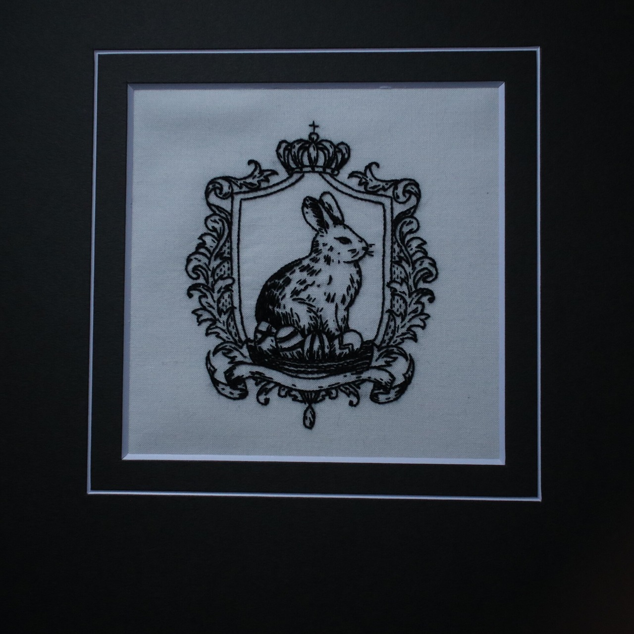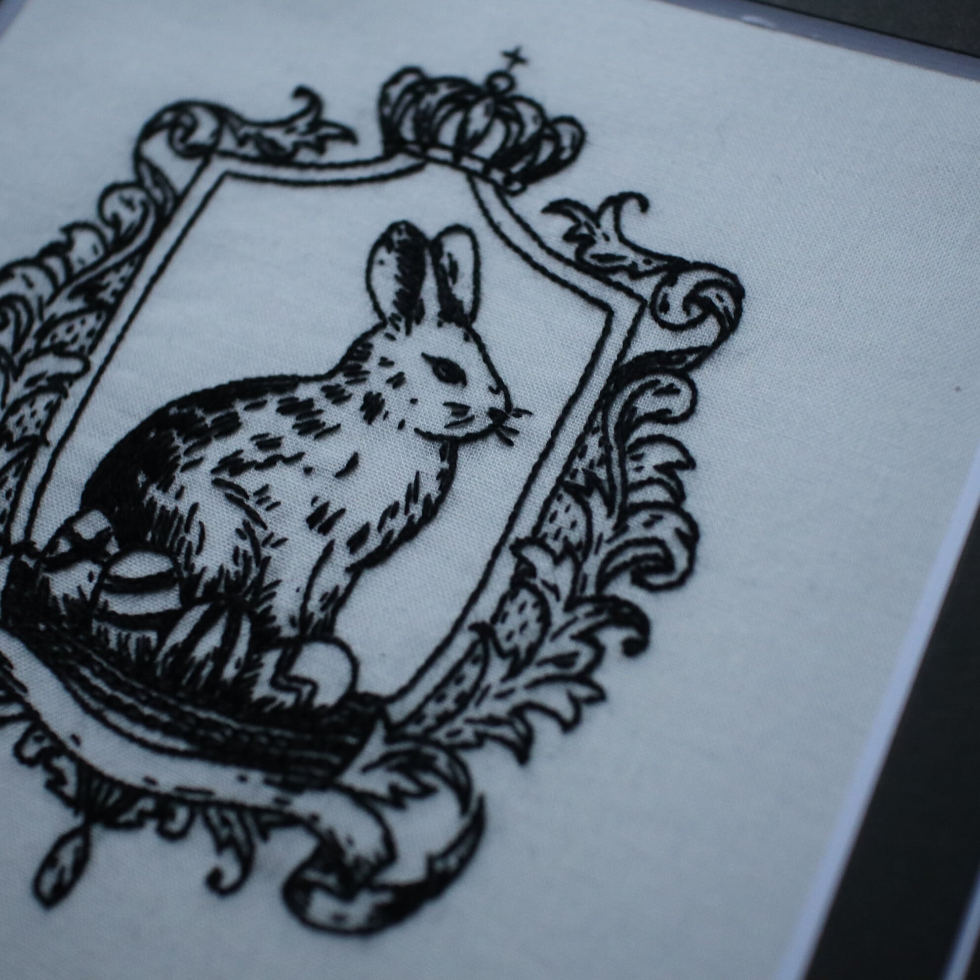 うさぎと卵のイースターをモチーフにしながらも、甘さを抑えた、静かでアンティークな雰囲気に仕上げた刺繍図案です。